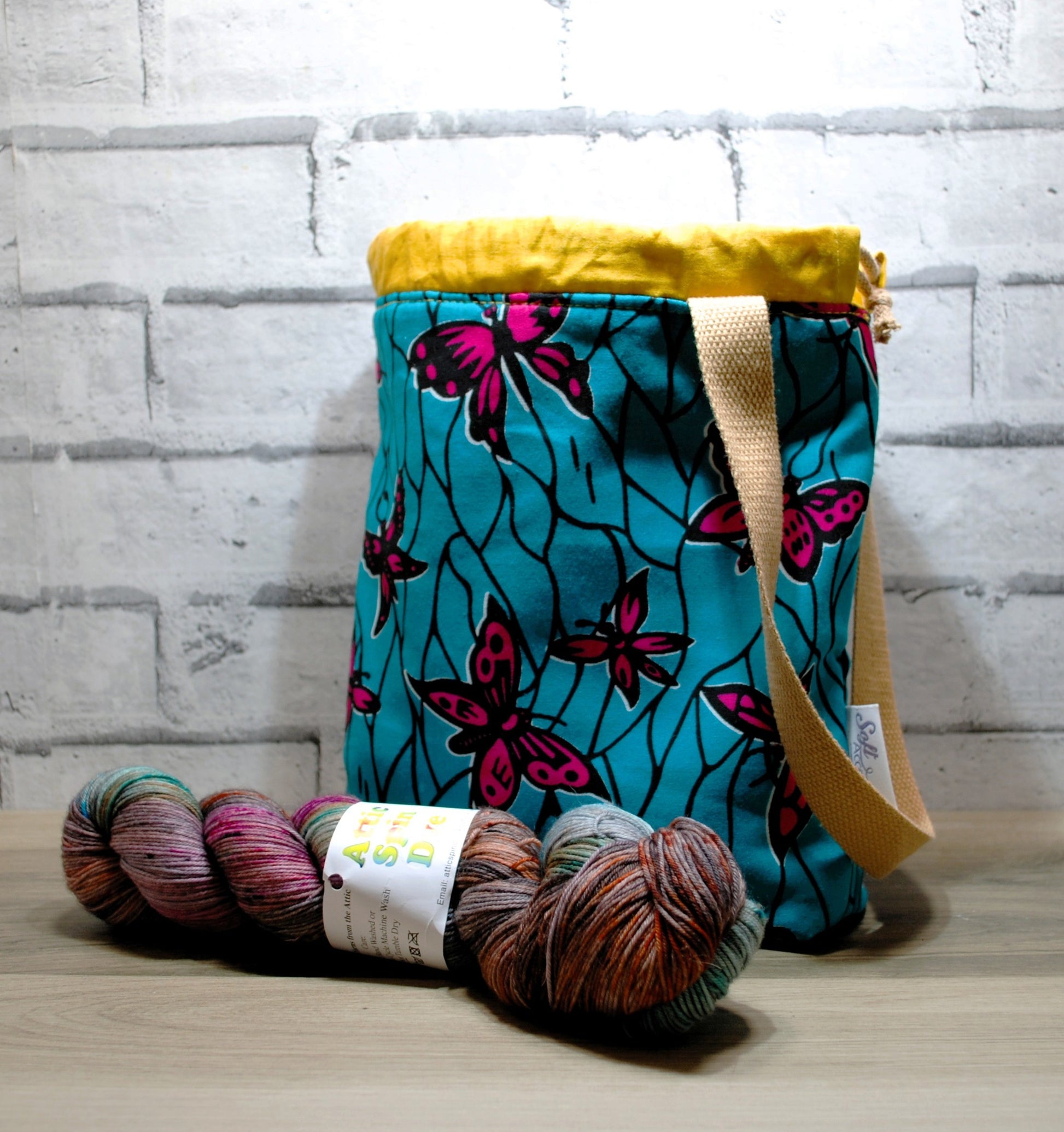 The project bag is an size for small projects such as hats and socks, fitting 1-2 skeins of yarn.