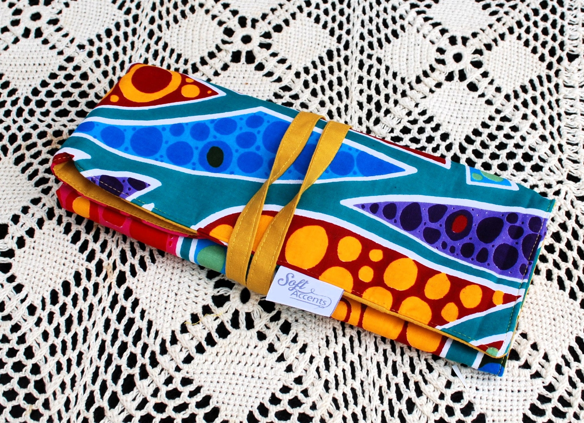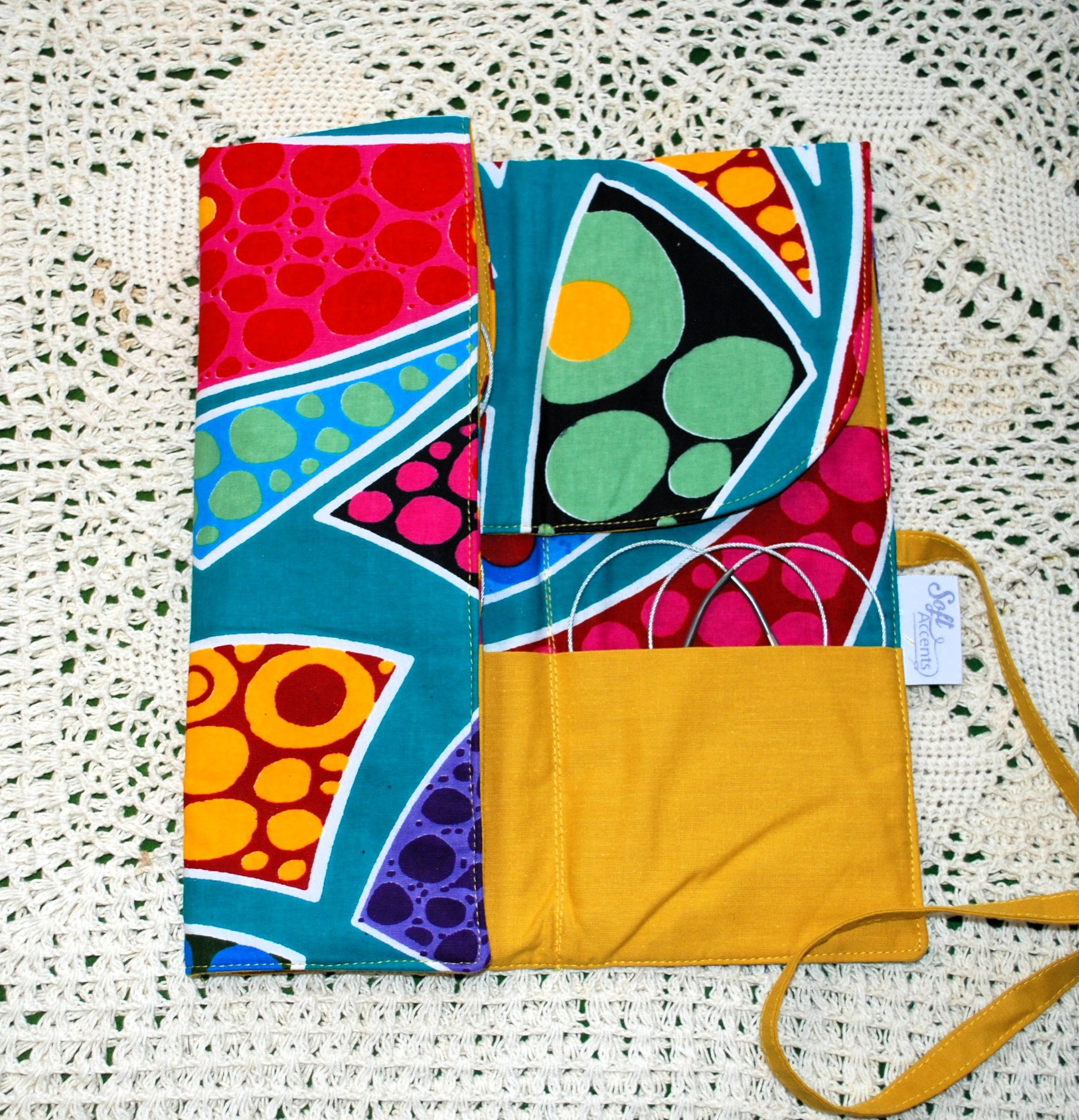Gift set for Knitters - Circular needle case with a Yarnologist stitch marker tin.  The tin contains five stitch markers (donuts, cakes and biscuits).  The roll up case is made with African Print Fabric and  has 9 pockets.