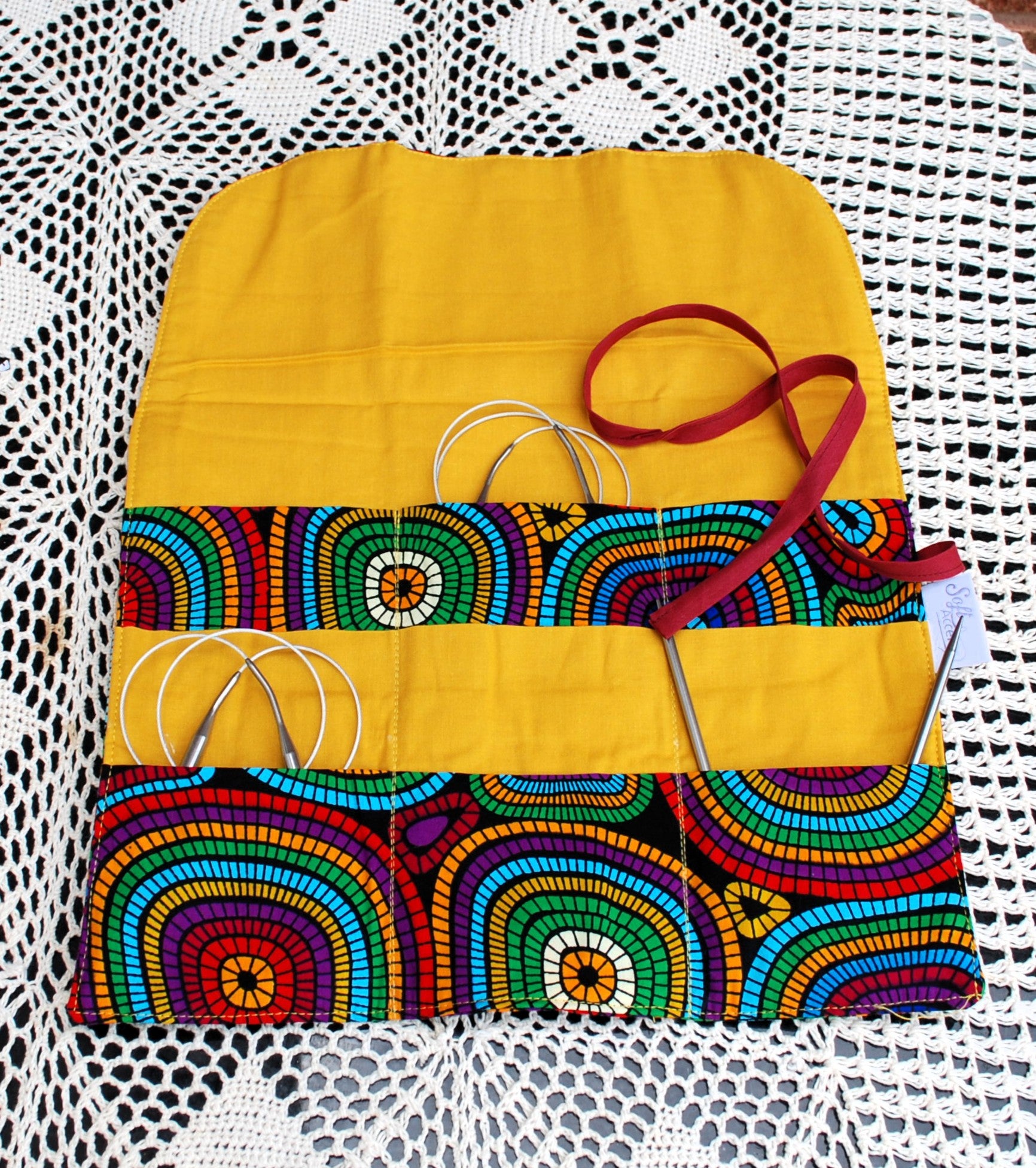 Gift set for Knitters - Circular needle case with a Yarnologist stitch marker tin. The tin contains five stitch markers (donuts, cakes and biscuits). The roll up case is made with African Print Fabric and has 9 pockets.