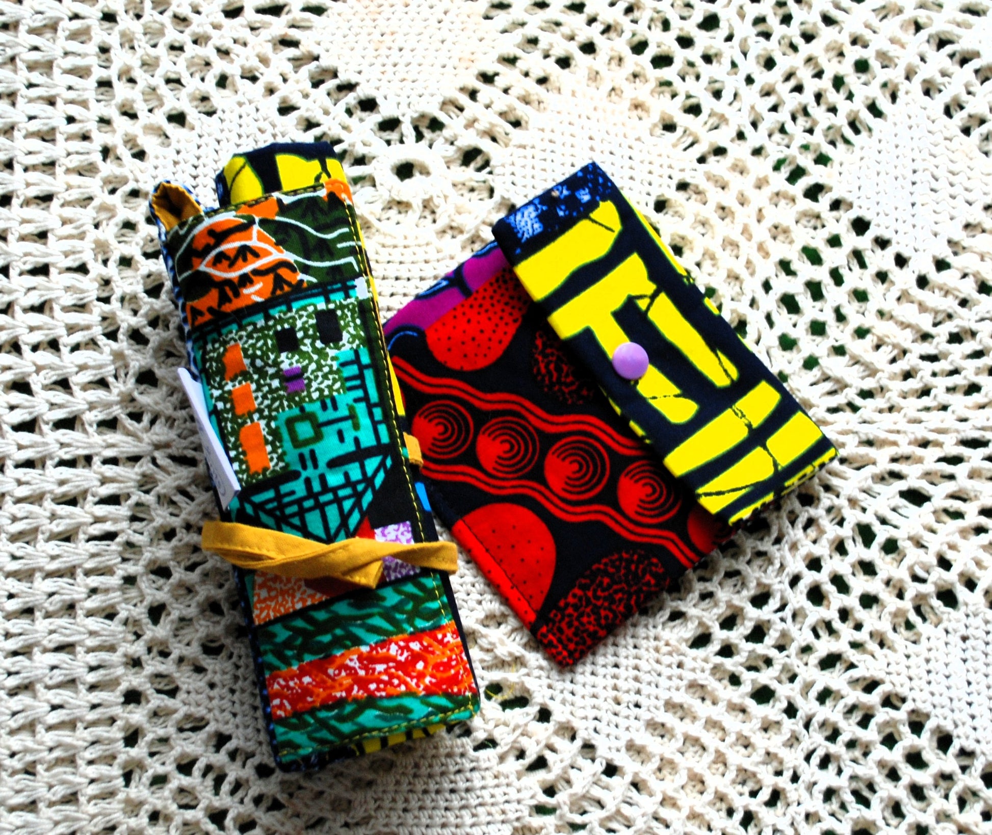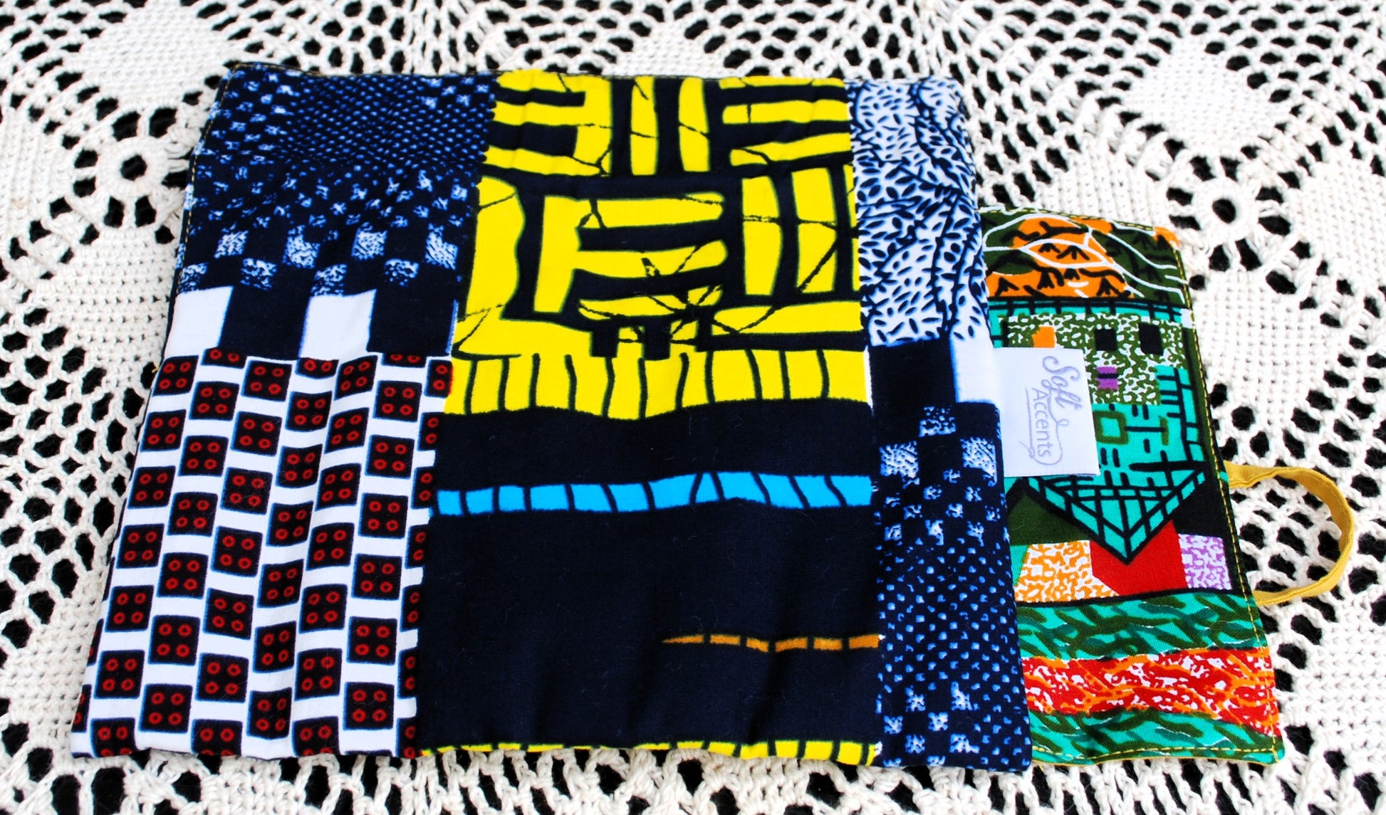 Gift set for Crocheters - Crochet hook roll with a small snap closure notion pouch. The roll up case is made with African Print Fabric and has 7 slots for storing hooks.