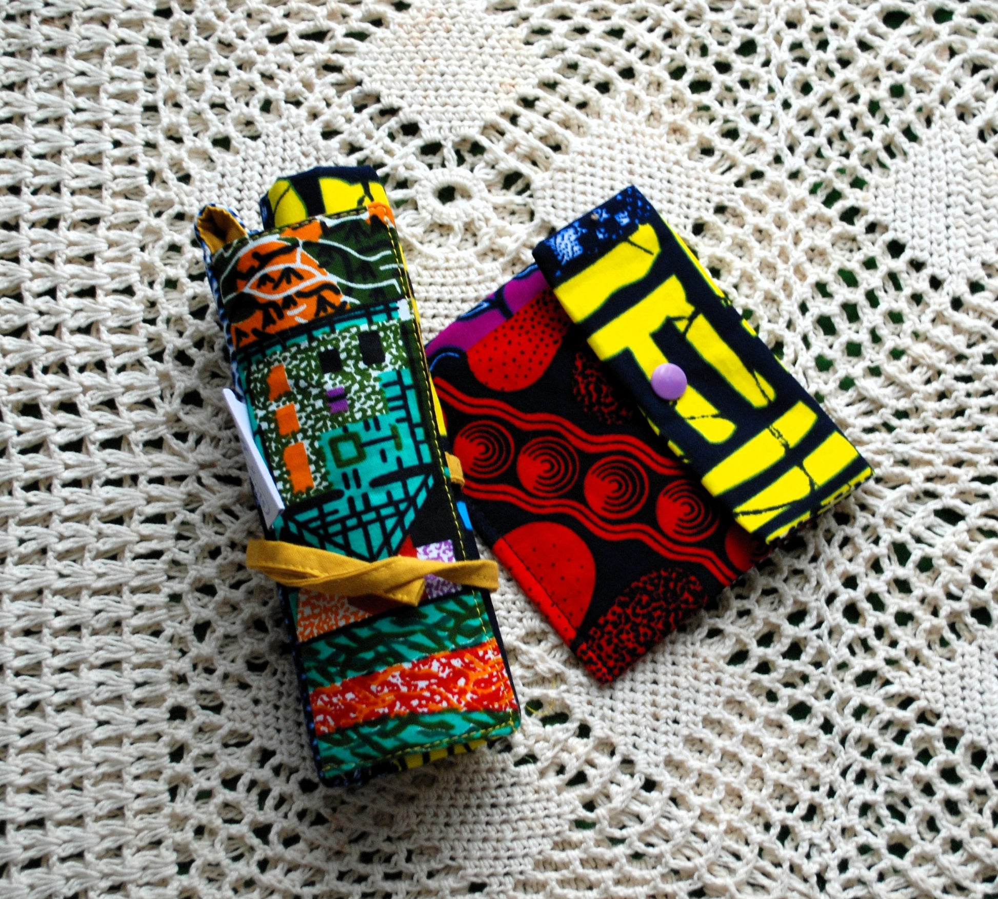 Gift set for Crocheters - Crochet hook roll with a small snap closure notion pouch.  The roll up case is made with African Print Fabric and  has 7 slots for storing hooks.